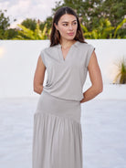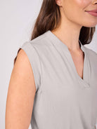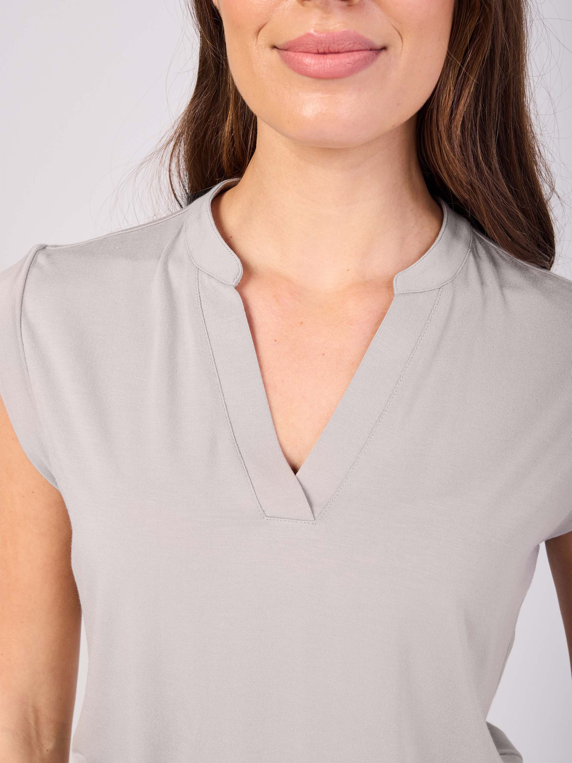 The thoughtful cap sleeve is designed to flatter the upper arm, while the refined placket is enhanced by a softly structured collar detail that frames the neckline for a polished finish. Cut to a perfect bum-covering length, it offers confidence and ease of movement, whether paired with leggings, wide-leg pants, or denim.