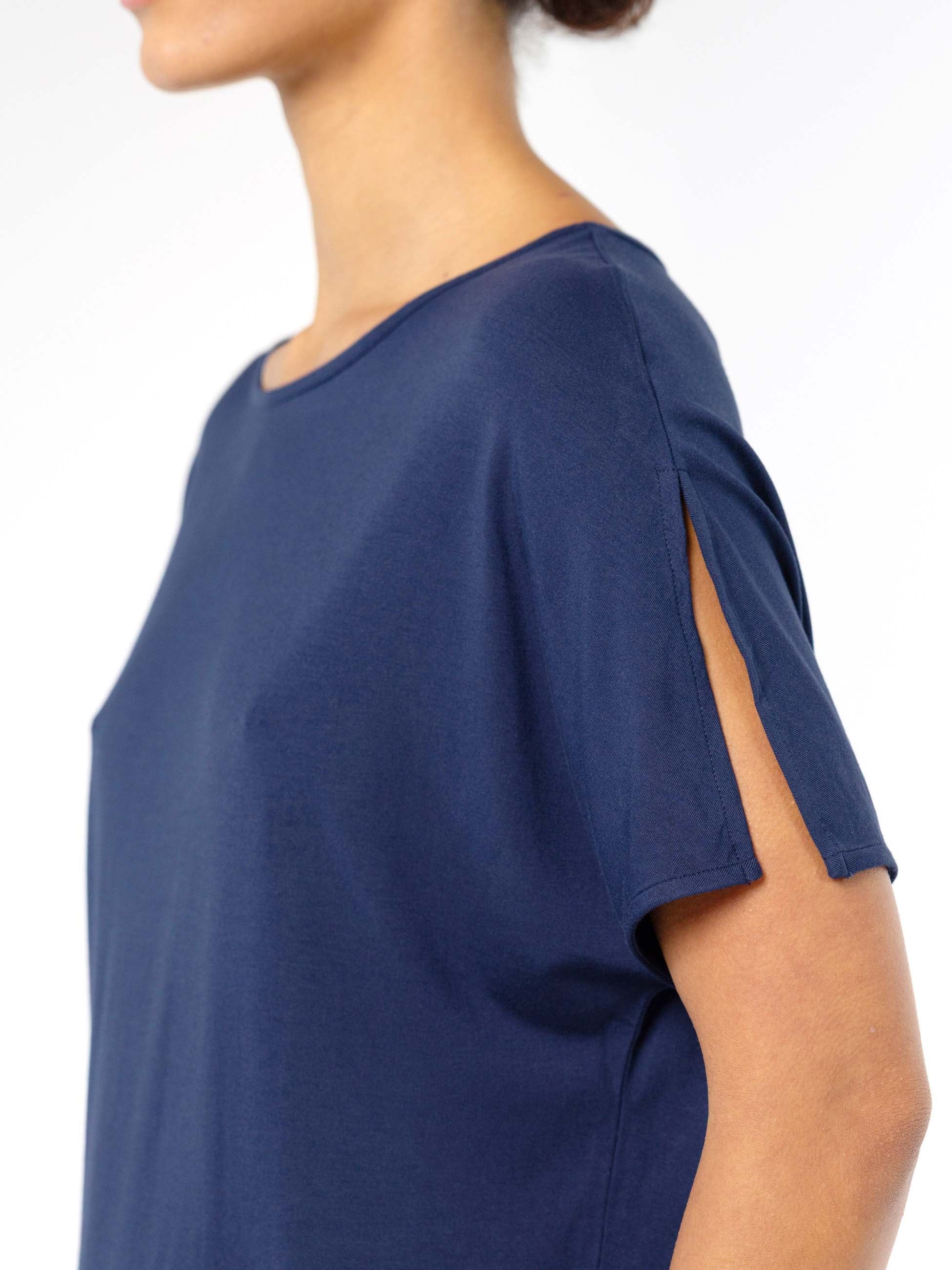 Designed with a classic round neckline and short sleeves featuring a subtle split detail, it brings a refined twist to a timeless silhouette. The length flatters all body shapes and pairs effortlessly with any bottoms from our Modal collection.